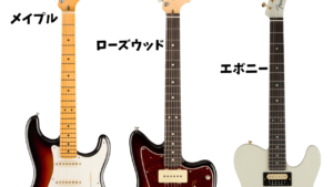 ローズウッド指板はしっとりした手触りで、温かみのある音が特徴。メイプル指板はツルツルした感触で、明るい音色になります。エボニー指板は高級感があり、ジャズやメタルで好まれます。
